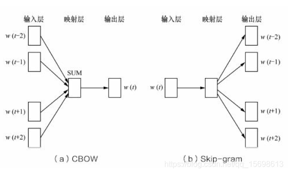 w(t)是当前所关注的词,w(t-2)、w(t-1)、w(t+1)、w(t+2)是上下文出现的词,前后滑动窗口大小均设成2。