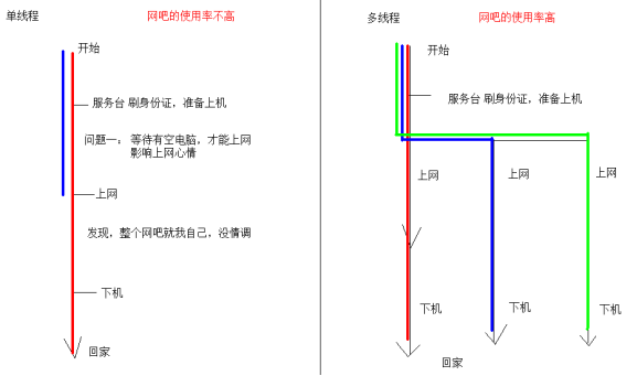 l 单线程程序:即,若有多个任务只能依次执行。当上一个任务执行结束后,下一个任务开始执行。如,去网吧上网,网吧只能让一个人上网,当这个人下机后,下一个人才能上网。