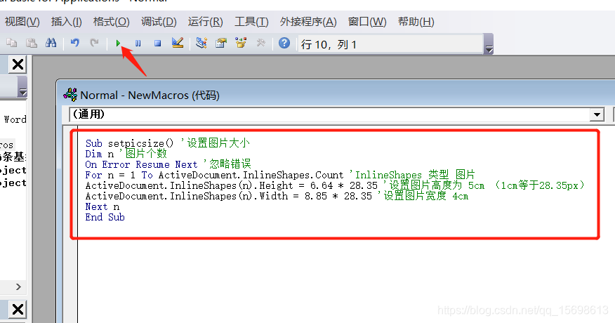 Sub setpicsize() '设置图片大小Dim n '图片个数On Error Resume Next '忽略错误For n = 1 To ActiveDocument.InlineShapes.Count 'InlineShapes 类型 图片ActiveDocument.InlineShapes(n).Height = 5 * 28.35 '设置图片...