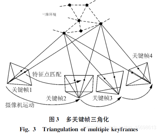 - 目前采用关键帧与稀疏捆绑调整( sparse bundle adjustment, SBA) 框架的单目视觉SLAM 系统, 普遍采用类似运动恢复结构( structure from motion,SFM) 中的多关键帧匹配点三角化,重建特征点的三维位置,如图3 所示。
