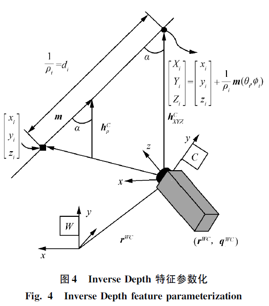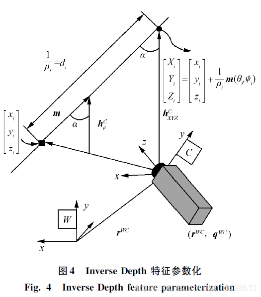 - 随着滤波器不断地进行更新,当特征估计协方差小于某一阈值的情况下,将特征点的6 维表示转换为3 维的欧式坐标( 如图4)