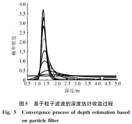 - ParticleFilter 方法最先被Davison 采用,当特征初始化以后,在特征所在深度方向生成多个粒子。通过粒子的匹配与更新,恢复特征点深度的概率分布,其深度估计的收敛过程如图5 所示。