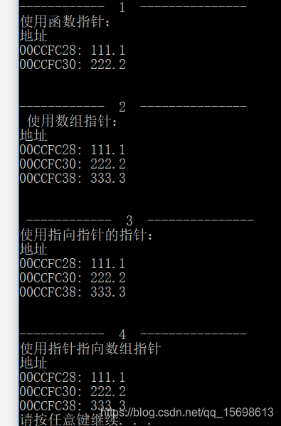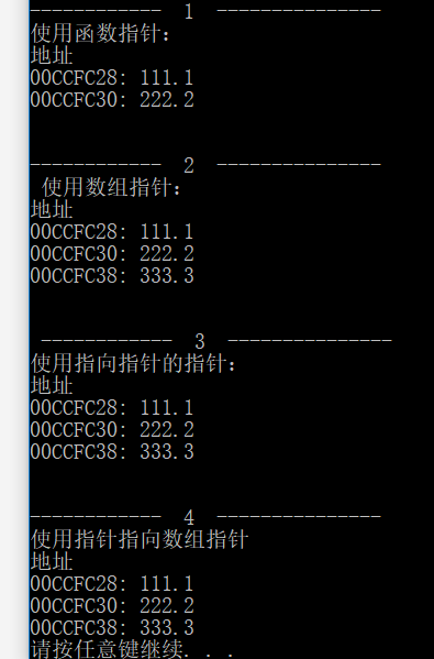 假设要声明一个指针,指向三个函数中的一个,指针名为pa, 则将函数名替换为(*pa)