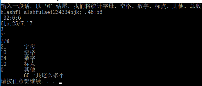 //输入一段话,以‘@’结尾,我们将统计字母、空格、数字、标点、其他、总数