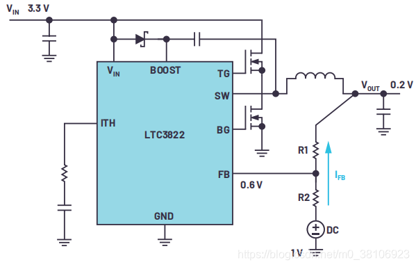如下图所示,例如ADI 开关稳压器LTC3822,它以0.6 V的基准电压产生0.6 V的反馈电压。但是,如果需要输出低于0.6 V的直流电源电压,则无法使用。