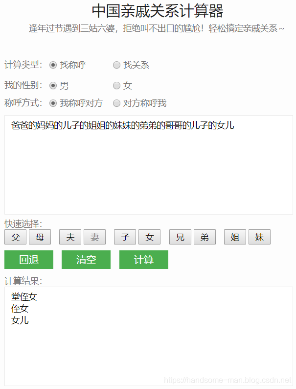 “中国家庭称谓计算器”为你避免了这种尴尬,只需简单的输入即可算出称谓。输入框兼容了不同的叫法,你可以称呼父亲为:“老爸”、“爹地”、“老爷子”等等,方面不同地域的习惯...