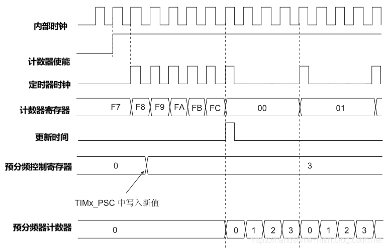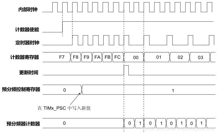 假设计数器寄存器数值为0xFC,采用4预分频, 时序图如下所示: