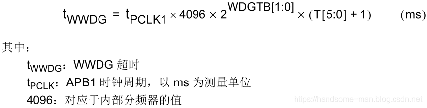 STM32L011中窗口看门狗定时器基于APB1频率,假设APB1 频率等于 32 MHZ,定义65毫秒周期的窗口看门狗定时器,计算方式如下所示: