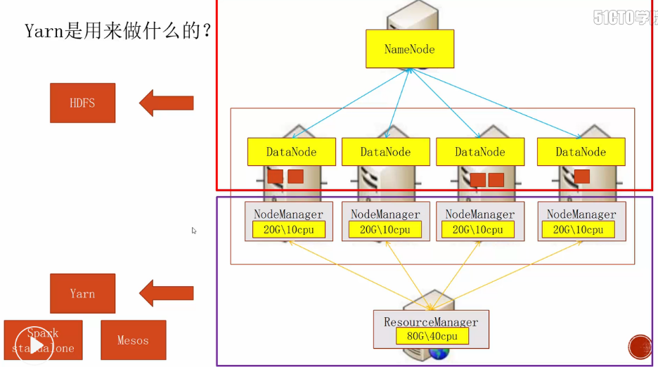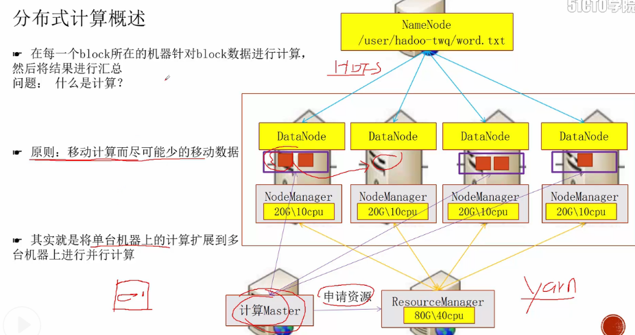分布式集群的计算资源管理,包括对内存以及cpu的管理,也是符合主从结构,主ResourceManager 负责集群资源的调控,负责单个服务器上资源的管理。