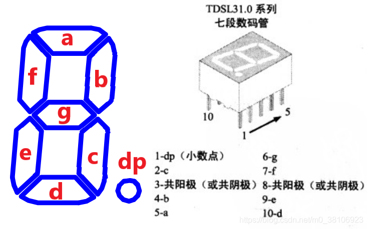 )组成,7个亮段实际上就是7个条形的发光二极管,按顺时针方向,这7个亮段分别为a、b、c、d、e、f、g大多数七段数码管还带有一个小数点位dp。如下图所示:
