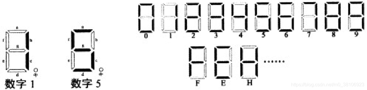7段数码管有多种颜色、多种尺寸供设计时使用,它们的显示原理相同。如果要7段数码管显示数字1,只要点亮b、c两段即可;如要显示数字5,则需要点亮a、f、g、c、d段。其他数字和一些字母可以按照下图中的说明点亮对应的亮段来显示,7个亮段可以灵活地表现数字和一些字母信息。
