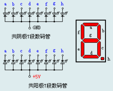 7段数码管中亮段的发光原理和普通的发光二极管是一样的,所以可以把这7个亮段看成7个发光二极管,根据内部7个发光二极管的共连端不同,可将七段数码管分为共阳(共阳极)和共阴(共阴极)两种。共阳极就是把所有LED的阳极(正极)连接到