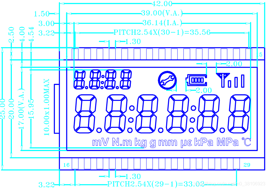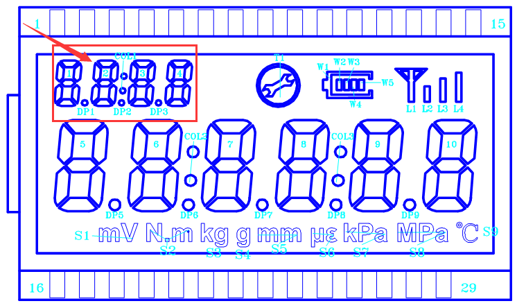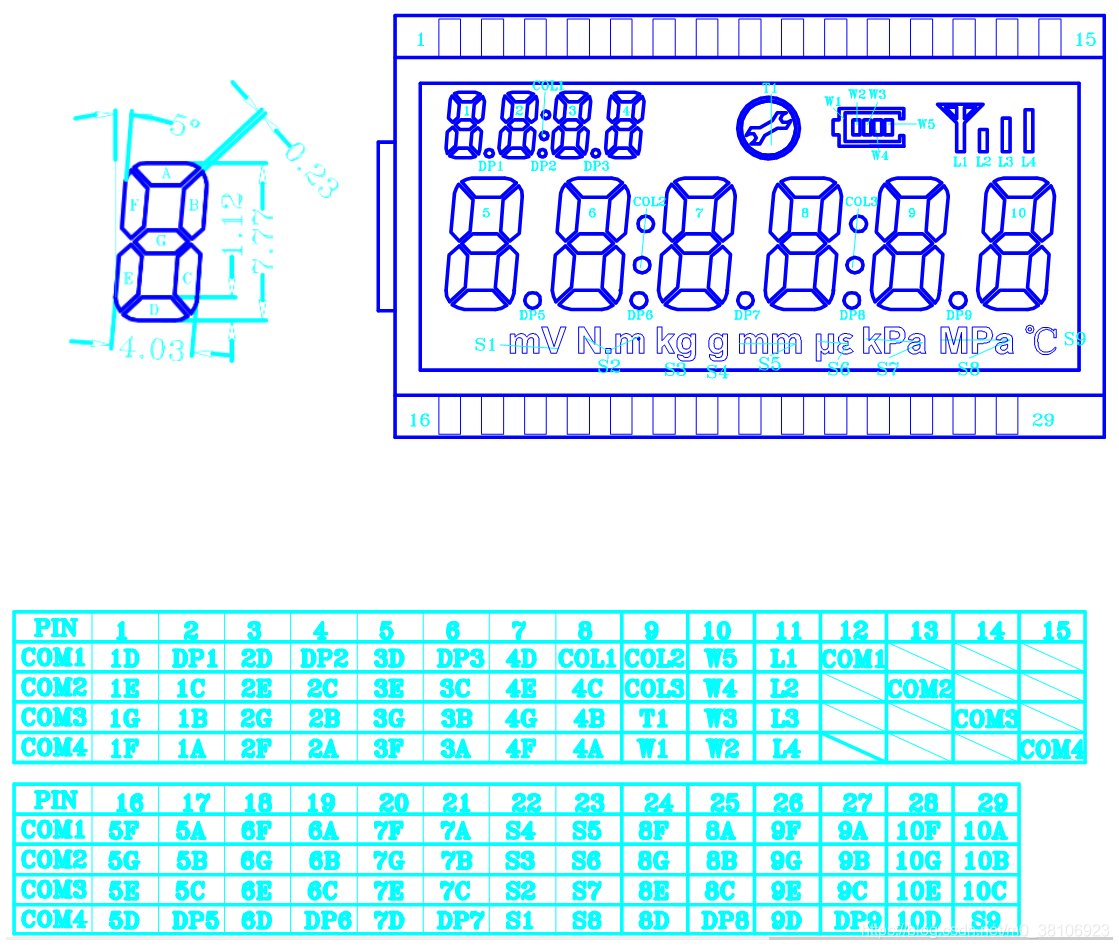 该LCD数码屏有4个公共端,29个端口,在不借助驱动芯片的前提下,要保证MCU有29个富余的IO口,LCD数码屏引脚对应特性如下图所示:
