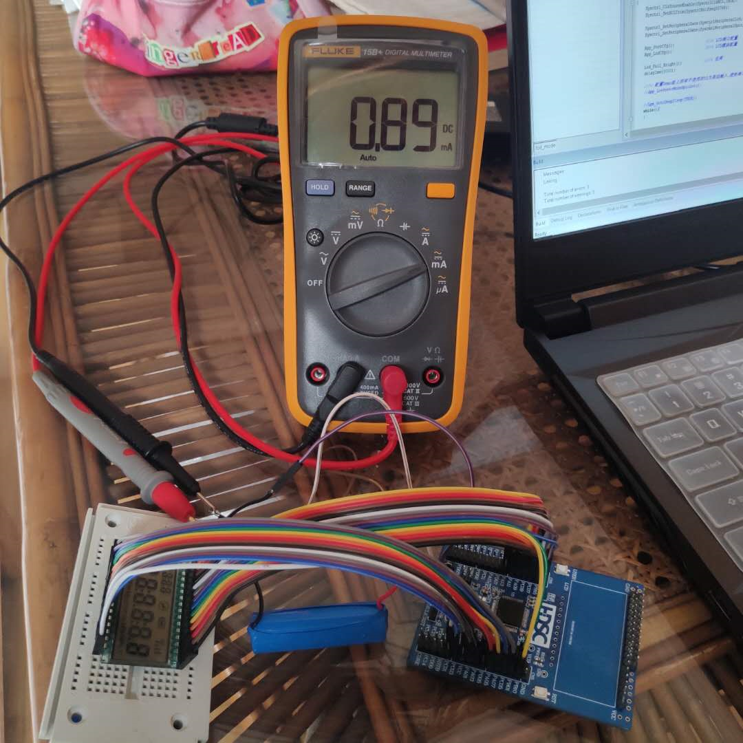 运行上述程序,LCD数码屏所有数码管工作点亮耗能约890毫安左右,如下图所示: