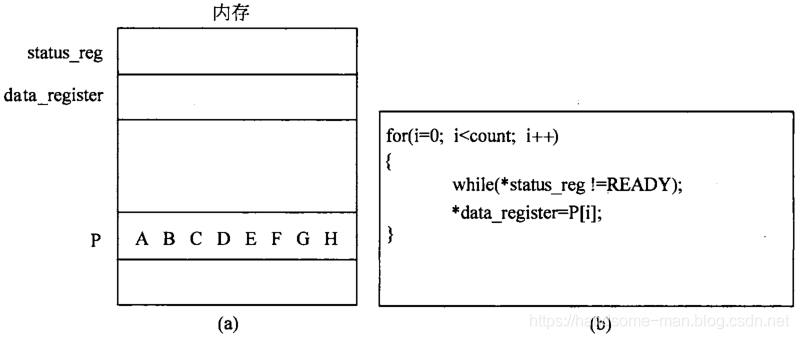 图(b) 所示是相应的程序。它的基本思路是:逐个去打印每一个字符。在打印一个字符之前,首先用一个while语句来检测打印机的当前状态,看它是否已经就绪,如果还没有就绪,就在这里循环等待;如果已经就绪,就把当前的字符送入到打印机的数据寄存器当中。在本例中,由于采用了内存映像的编址方式,因此,在程序员眼中,状态寄存器和数据寄存器都被看成是普通的内存单元,对它们的访问也是普通的赋值操作,不需要专门的I/O指令。但是这个赋值操作的功能与普通的赋值操作不同,它相当于是给打印机发出了一个命令,让它去打印一个字符。另外,每次打印完-一个字符后,都要重新判断设备是否就绪,因为相对于CPU来说,打印机是一个慢速设备,它在执行打印命令时,不可能像CPU那么快,而是需要一定的时间来完成。因此,当CPU把一个字符交给它之后,必须循环等待一段时间, 才能去处理下一一个字符。