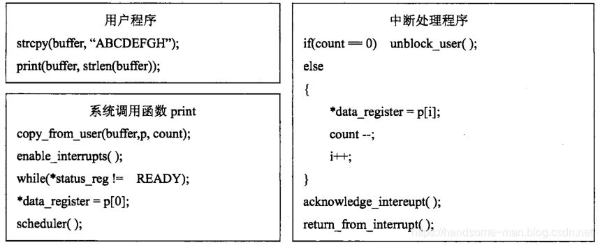 当打印机完成一个字符后,将向CPU发出一个中断。在中断处理程序当中,首先判断一下,如果所有的字符都已打印完,那么就去阻塞队列中,把用户任务唤醒,使它处于就绪状态;如果还有字符需要打印,就直接把下一个字符复制到打印机的数据寄存器当中,启动打印操作,而不需要再去循环地判断打印机是否就绪。接下来是一些后继处理,先向中断控制器发出一个确认信号,然后结束中断处理程序,返回到被中断的那个任务。