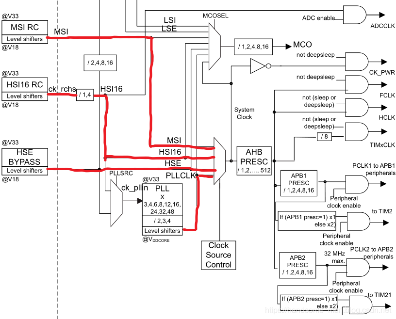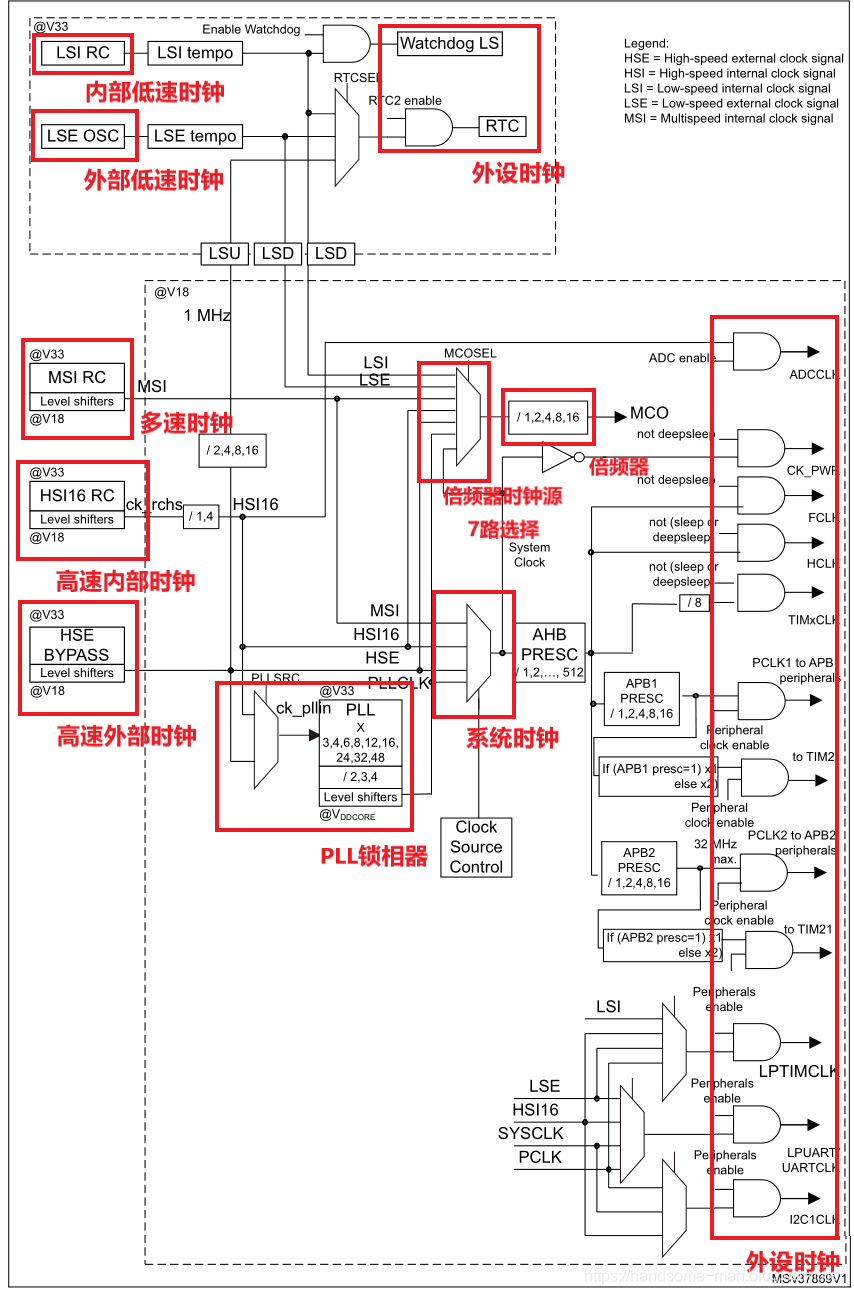 时钟树并不难读懂,沿着导线耐心一步步可以很快理解,例如系统时钟可支持MSI、HSI16、HSE和PLLCLK四种时钟源配置,其中HSI16时钟源可支持倍频器分频(1倍和4倍),PLLCLK锁相环倍频输出可支持HSI16和HSE时钟源两种时钟源配置,并且进行倍频输出(预分频寄存器和时钟倍频寄存器配置)。