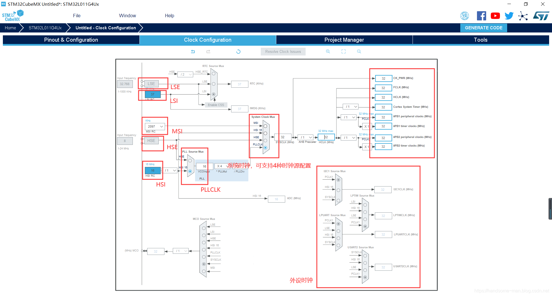 参照STM32时钟树配置STM32CubeMX Clock Configuration(STM32L011G4U6为例)