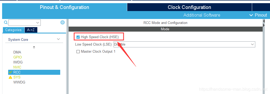 需要注意,部分配置不可选是由于没开启相关的IO配置,例如HSE时钟源。