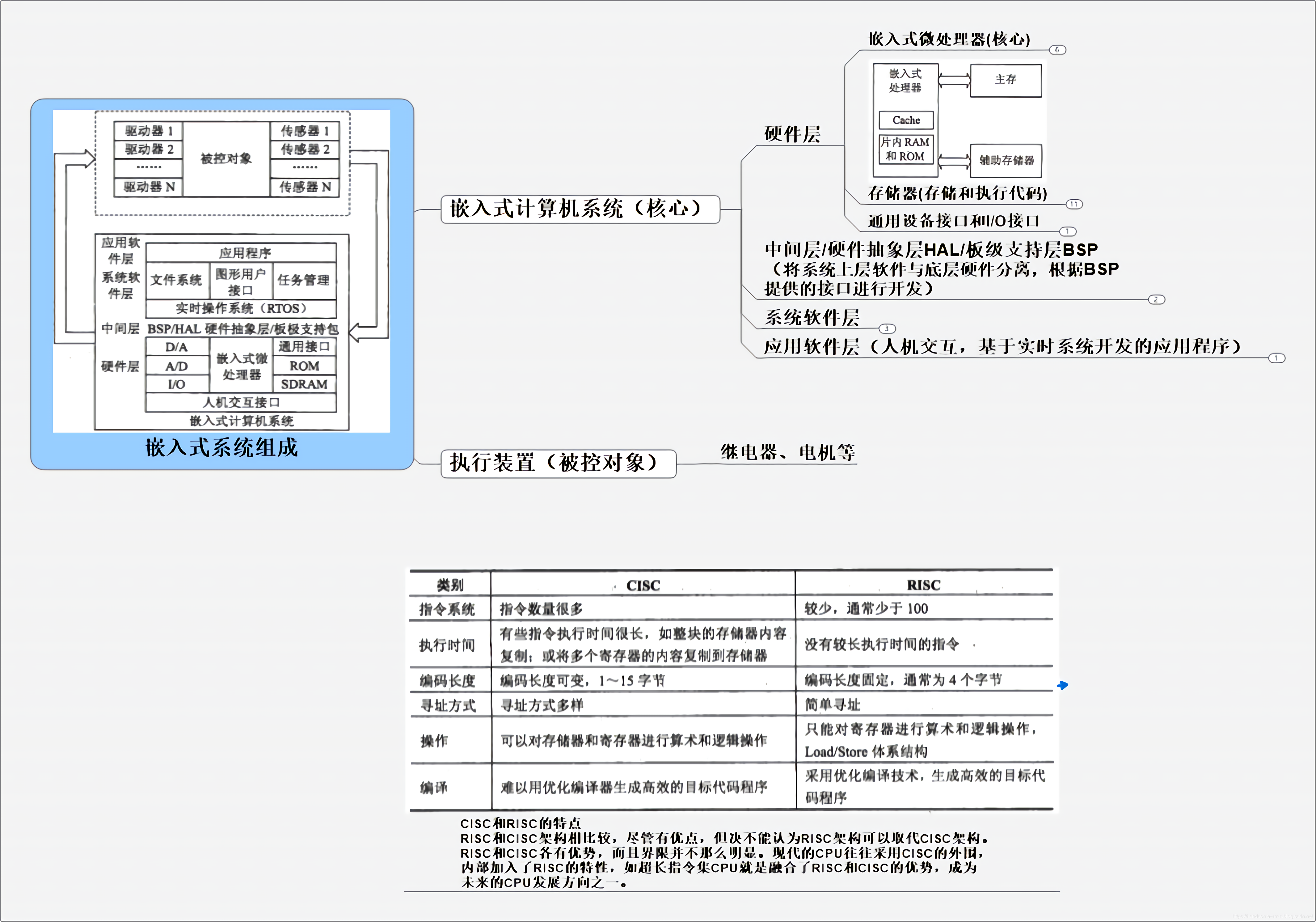 一个嵌入式系统装置一般都由嵌入式计算机系统和执行装置组成,下图是我对嵌入式系统组成的总结(缩略图),嵌入式计算机系统是整个嵌入式系统的核心,由硬件层、中间层、系统软件层和应用软件层组成。执行装置也称为被控对象,它可以接受嵌入式计算机系统发出的控制命令,执行所规定的操作或任务。执行装置可以很简单,如手机上的-一个微小型的电机,当手机处于震动接收状态时打开;也可以很复杂,如SONY智能机器狗,上面集成了多个微小型控制电机和多种传感器,从而可以执行各种复杂的动作和感受各种状态信息。
