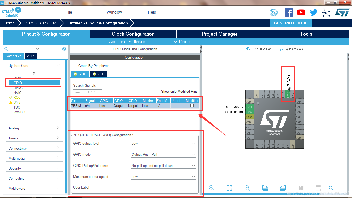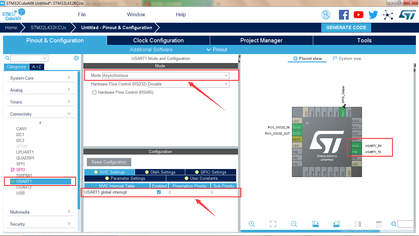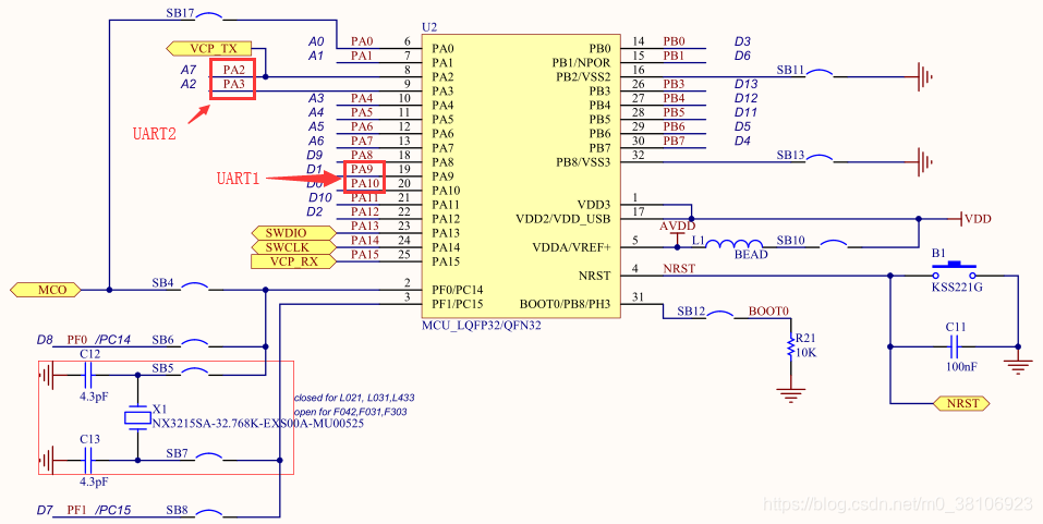 - 分析STM32L432KC芯片手册可知,UART1(TX=PA9,RX=PA10)和UART2(TX=PA2,RX=PA3)的GPIO端口及属性;