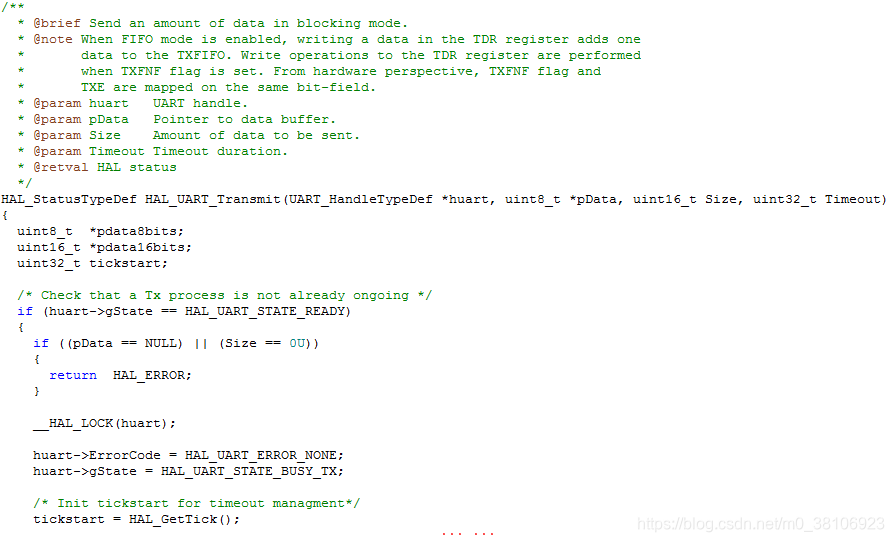 HAL_StatusTypeDef HAL_UART_Transmit(UART_HandleTypeDef *huart, uint8_t *pData, uint16_t Size, uint32_t Timeout),功能是串口发送函数,函数各个参数说明如下: