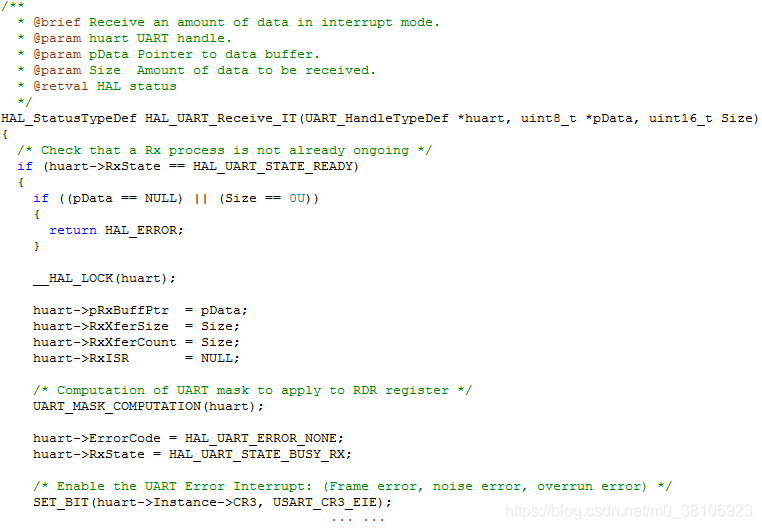 HAL_StatusTypeDef HAL_UART_Receive_IT(UART_HandleTypeDef *huart, uint8_t *pData, uint16_t Size),功能是串口接收函数,会触发接收中断,函数各个参数说明如下: