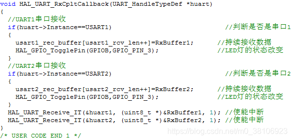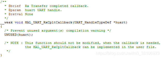 __weak void HAL_UART_RxCpltCallback(UART_HandleTypeDef *huart) ,功能是串口中断接收回调函数,当触发接收中断是,会调用此函数,所以用户需要重写该函数,函数各个参数说明如下: