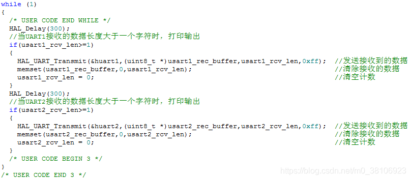 在main函数的while循环中编写串口接收处理函数,这里我是将接收的数据打印显示。