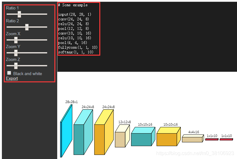 采用如下的语法直接配置网络,可以简单调整 x,y,z 等 3 个维度,GitHub地址:https://cbovar.github.io/ConvNetDraw/