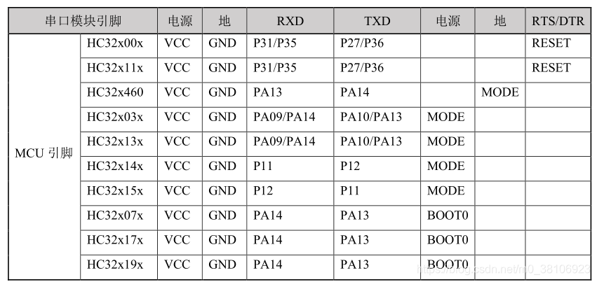 HC32L136就采用以下连接方式(RXD和TXD两组不一定都有效,像我用的HC32L136,RXD:PA14和TXD:PA13就无法打开串口):