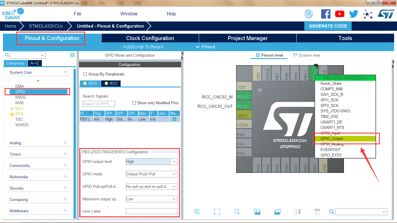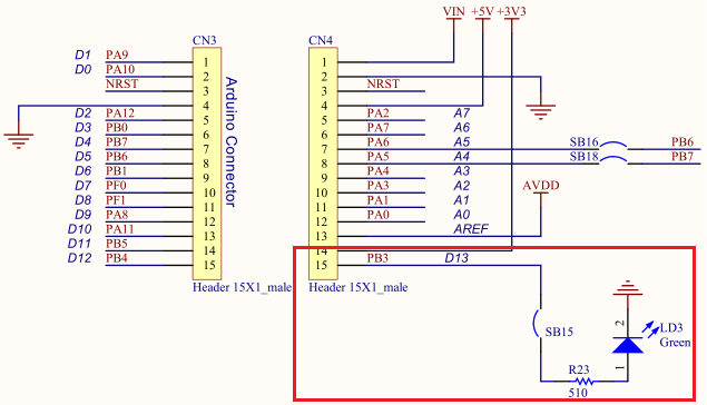 - 分析STM32L432KC LED灯原理图可知,LED灯连接在PB3引脚;
