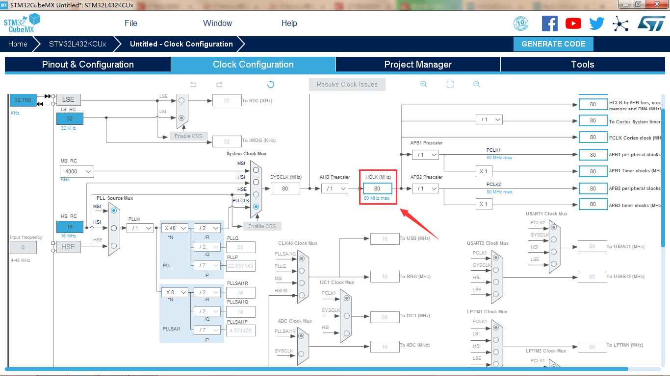 第4步:配置时钟。按照自己的工程要求配置时钟,本次以自动设置为例,直接将最后的频率设置为 80MHz(确定后电机回车),STM32CubeMX 会自动设置。