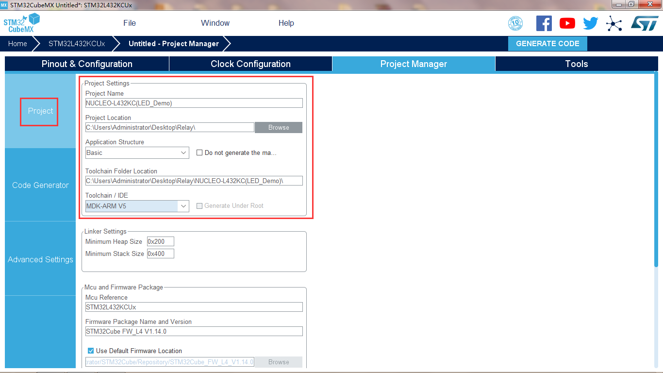 第5步:配置生成代码的一些配置。在 Project 界面设置本工程名称,选择按照什么开发工具生成项目工程,这里我们使用的是 MDK5。