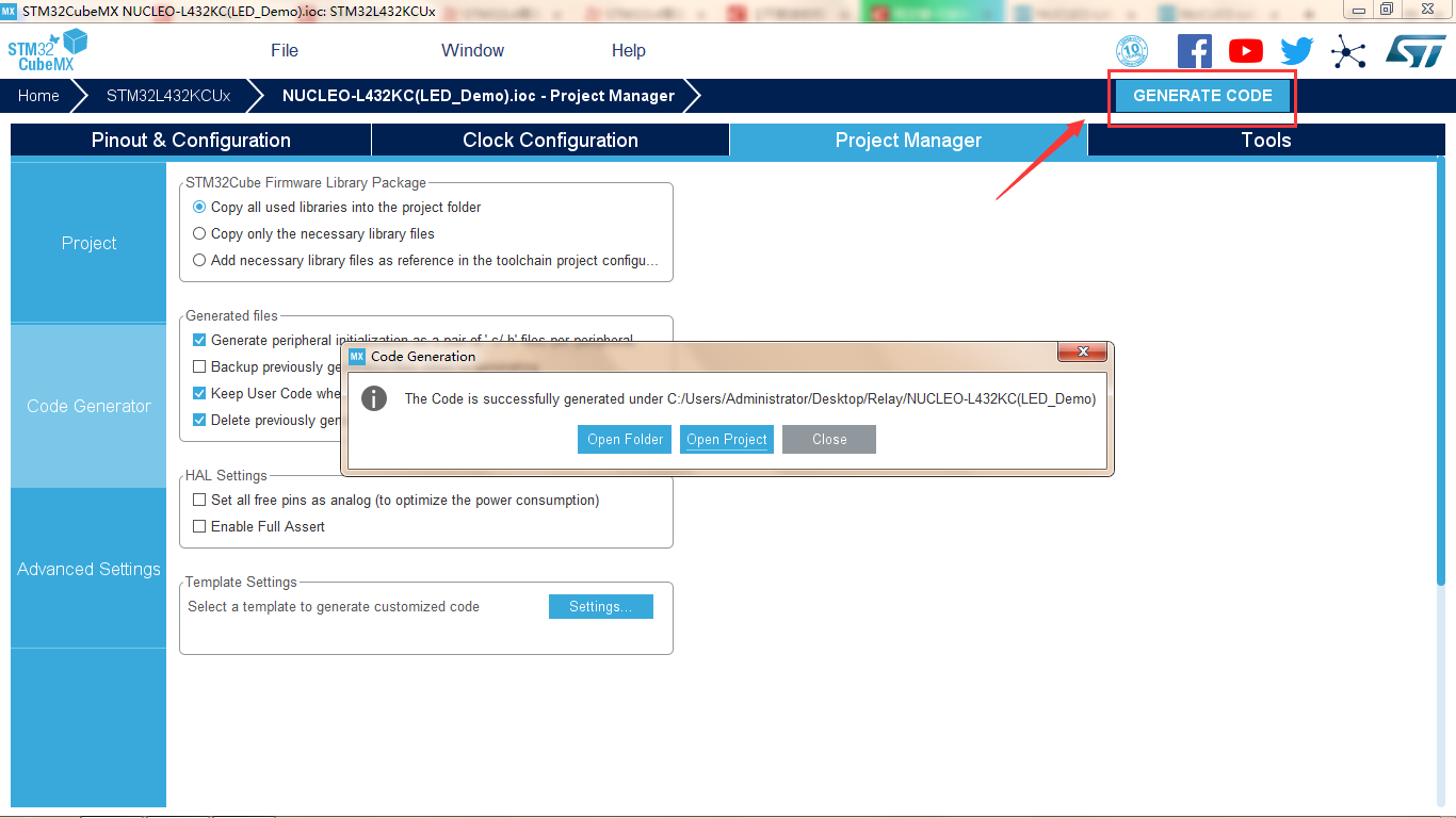 第6步:点击上面的 OK 生成工程代码。 生成工程代码成功后,可以选择打开工程目录或者直接打开工程。