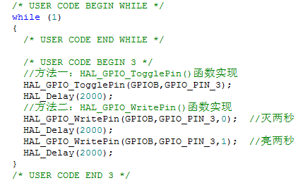 - 通过配置PB3引脚,结合驱动函数HAL_GPIO_TogglePin()和HAL_GPIO_WritePin(),可使用两种方式实现LED灯闪烁。