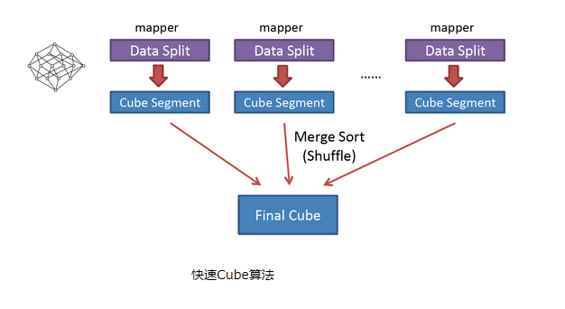 也被称作“逐段”(By Segment) 或“逐块”(By Split) 算法,从1.5.x开始引入该算法,该算法的主要思想是,每个Mapper将其所分配到的数据块,计算成一个完整的小Cube 段(包含所有Cuboid)。每个Mapper将计算完的Cube段输出给Reducer做合并,生成大Cube,也就是最终结果。如图所示解释了此流程。