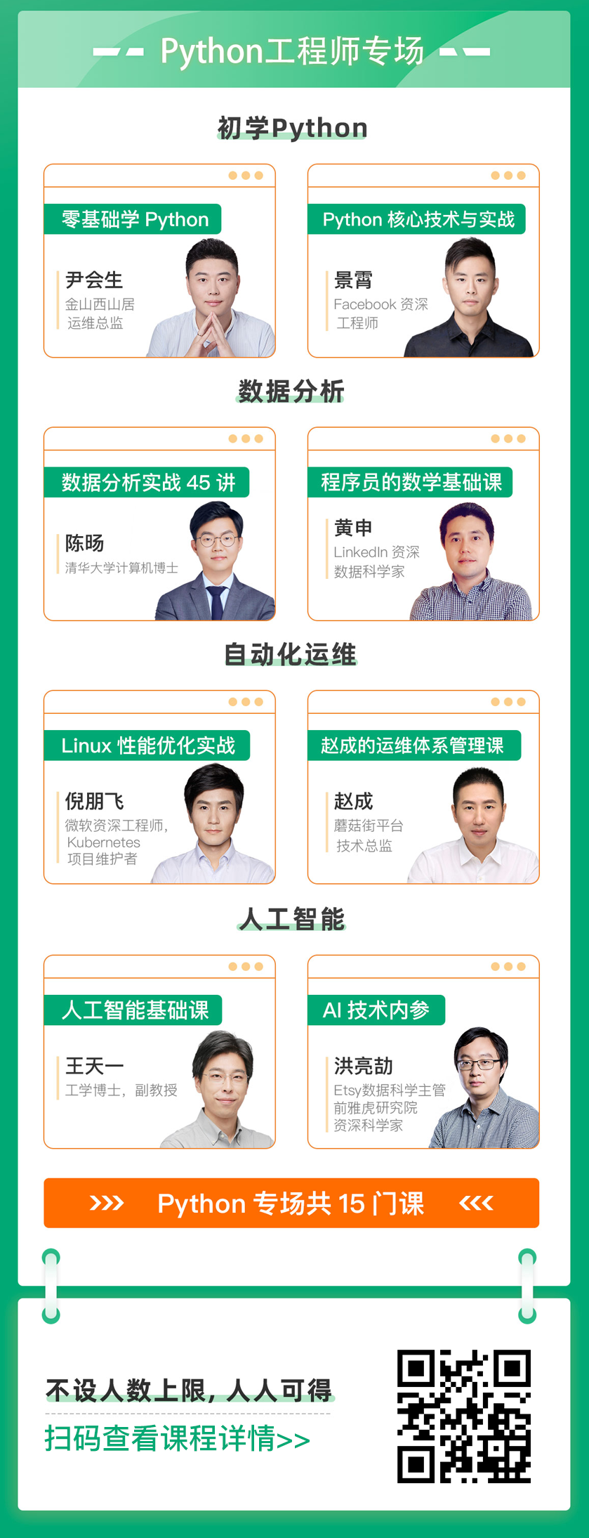 在《Python核心技术与实战》这门课中,Facebook资深工程师景霄老师从工程的角度讲解Python,以语言知识结合工程应用为主线,包含大量的独家解读和实际工作案例。巩固核心基础的同时,又能get很多高级进阶操作,想吃透Python的朋友可以学习这门课。