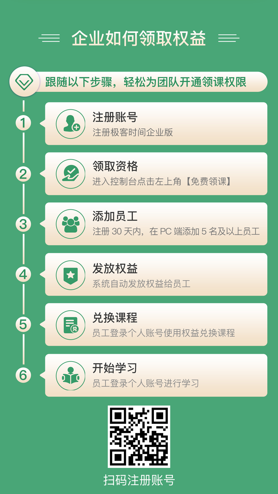心动不如行动!如果你是一个团队leader,可以带领队员先试学一下极客时间的课程;如果你是一名工程师,可以把这个好消息告诉你的团队,一起领免费课程来学习。扫码领课????