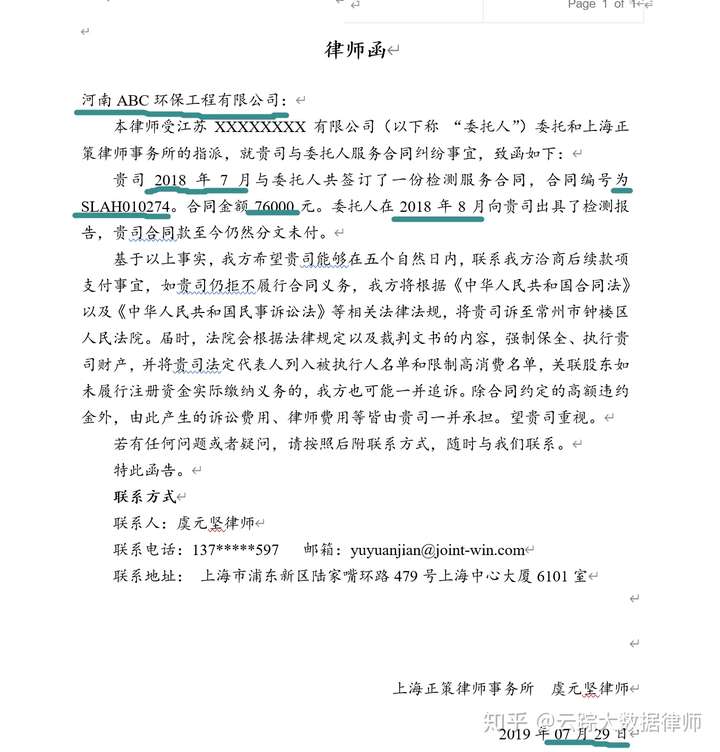 第三步:找一份该公司的律师函,作为模板,下标出来的地方,意味着这些部分是每份律师函根据对象不同需要调整的地方。