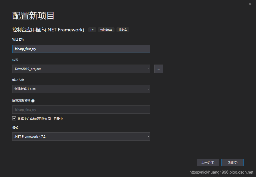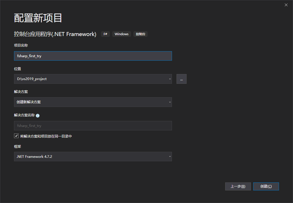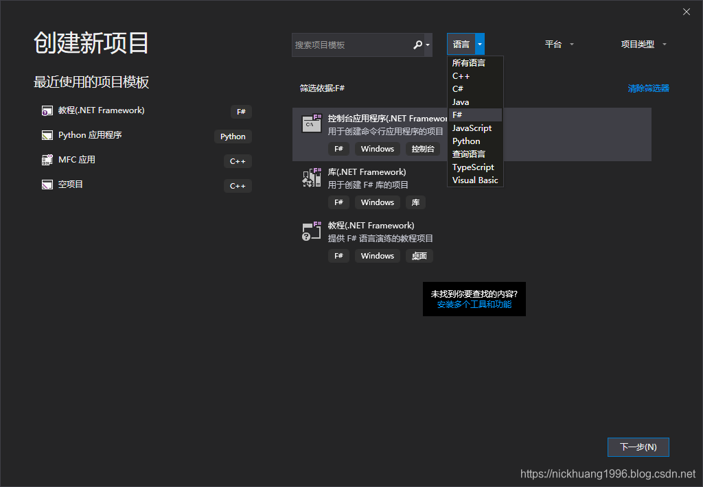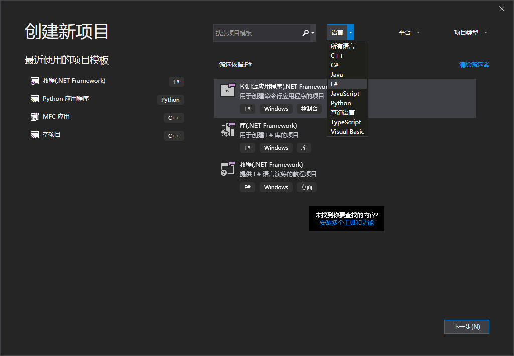 1.点击菜单栏-->文件-->新建-->项目,语言选择F#,选择控制台应用程序,下一步
