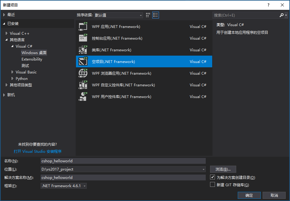 1.点击菜单栏-->文件-->新建-->项目,我这里以C#为例,右边栏选择其它语言-->Visual C#-->Windows桌面,中间选择空项目(.NET Framework),改变默认路径