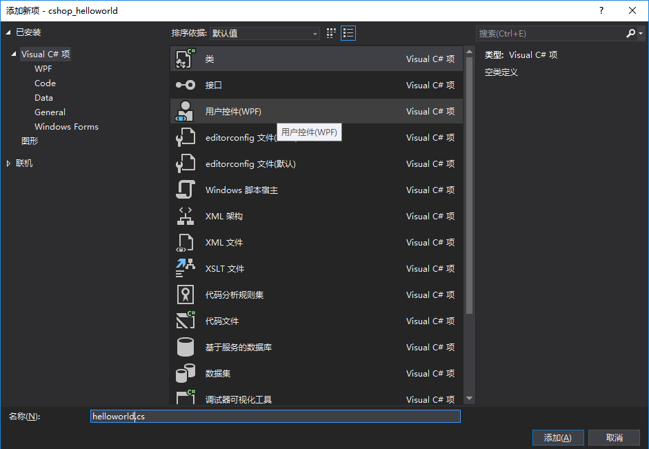 2.右键点击右边栏项目名称cshop_helloworld,点击添加-->新建项,会出现下面这个界面。和java一样,我们创建一个类即可,后缀名是.cs,也就是代表了C SHARP