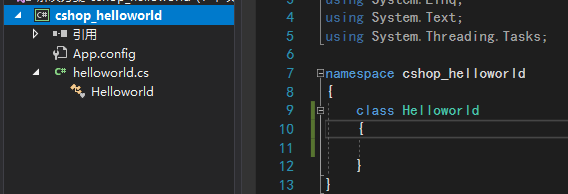 3.之后你的解决方案会多一个helloworld.cs的文件,右边是打开的未编辑的文件
