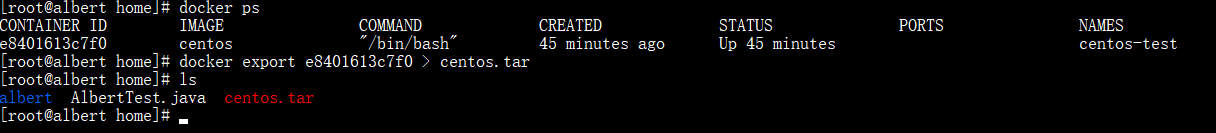 docker export 容器id > centos.tar # 导出容器 快照到本地文件 centos.tar
