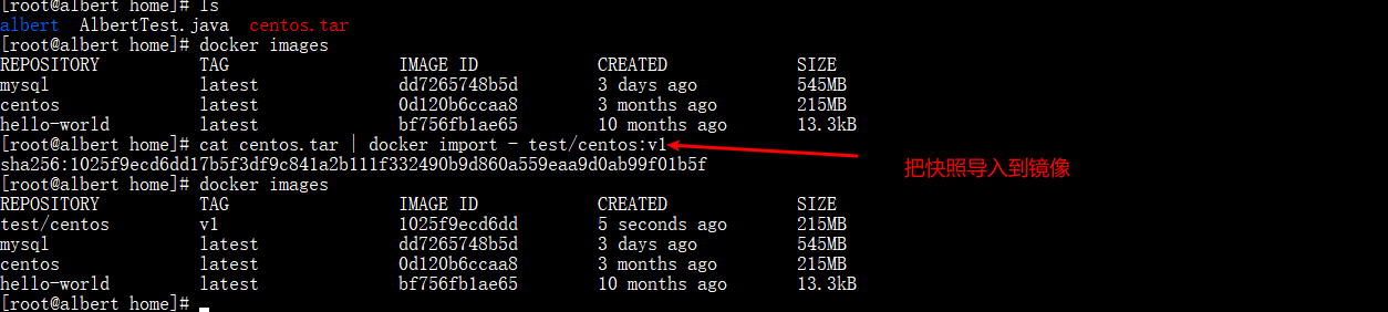 cat centos.tar | docker import - test/centos:v1 # 将快照文件 centos.tar 导入到镜像 test/centos:v1