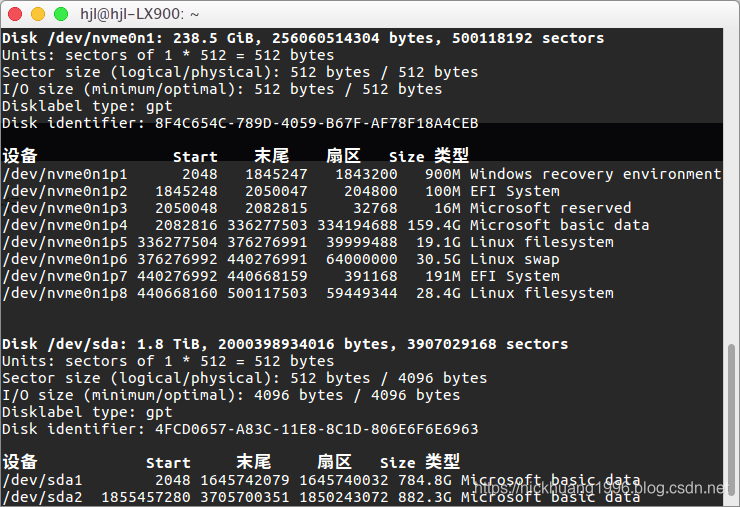 2.显示如下,主要看最后2行,/dev/sda1是Windows系统的D盘,/dev/sda2是Windows系统的F盘,主要挂载这两个分区
