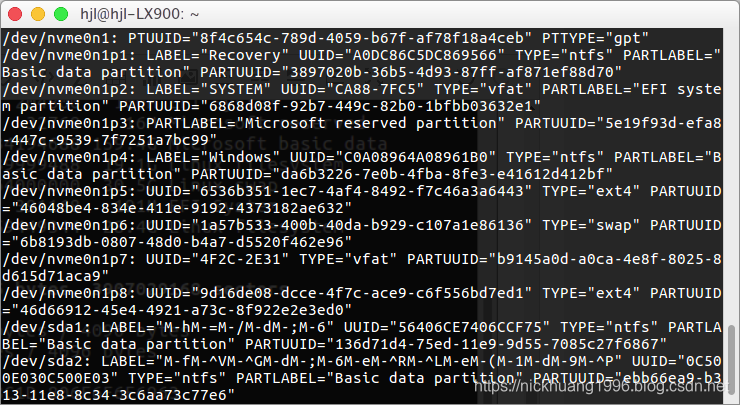 4.显示如下,可以看到最后几行/dev/sda1和/dev/sda2的TYPE,确实是ntfs