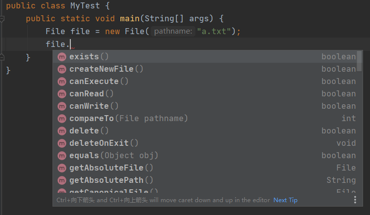 有了构造方法,我们可以通过构造方法创建对象,然后操作一波文件,创建对象之后,点一下,好家伙,很多可用方法,其实常用的不多。上号,开!
