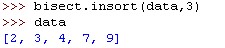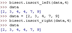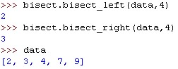 接着看 bisect_left 和 bisect_right 函数,该函数用入处理将会插入重复数值的情况,返回将会插入的位置: